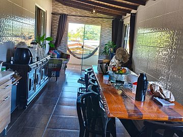 Varandão, cozinha com churrasqueira e fogão a lenha,