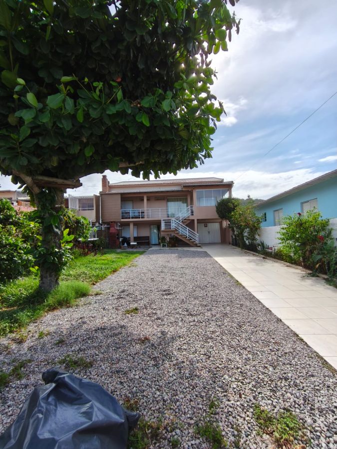 Piso inferior: 3 quartos, sala, cozinha, banheiro, área com churrasqueira e banheiro externo. Garagem fechada para 1 carro.